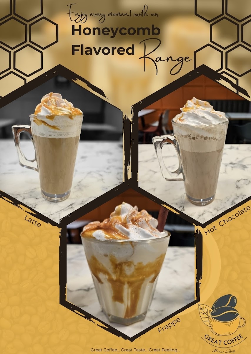 The menu at Great Coffee is a treasure trove for coffee lovers. Signature highlights include their unique honeycomb flavored range, featuring luscious lattes, indulgent hot chocolates, and refreshing frappes that are perfect for any time of day. Each drink is crafted with meticulously sourced beans, ensuring a rich flavor profile that delights the senses.